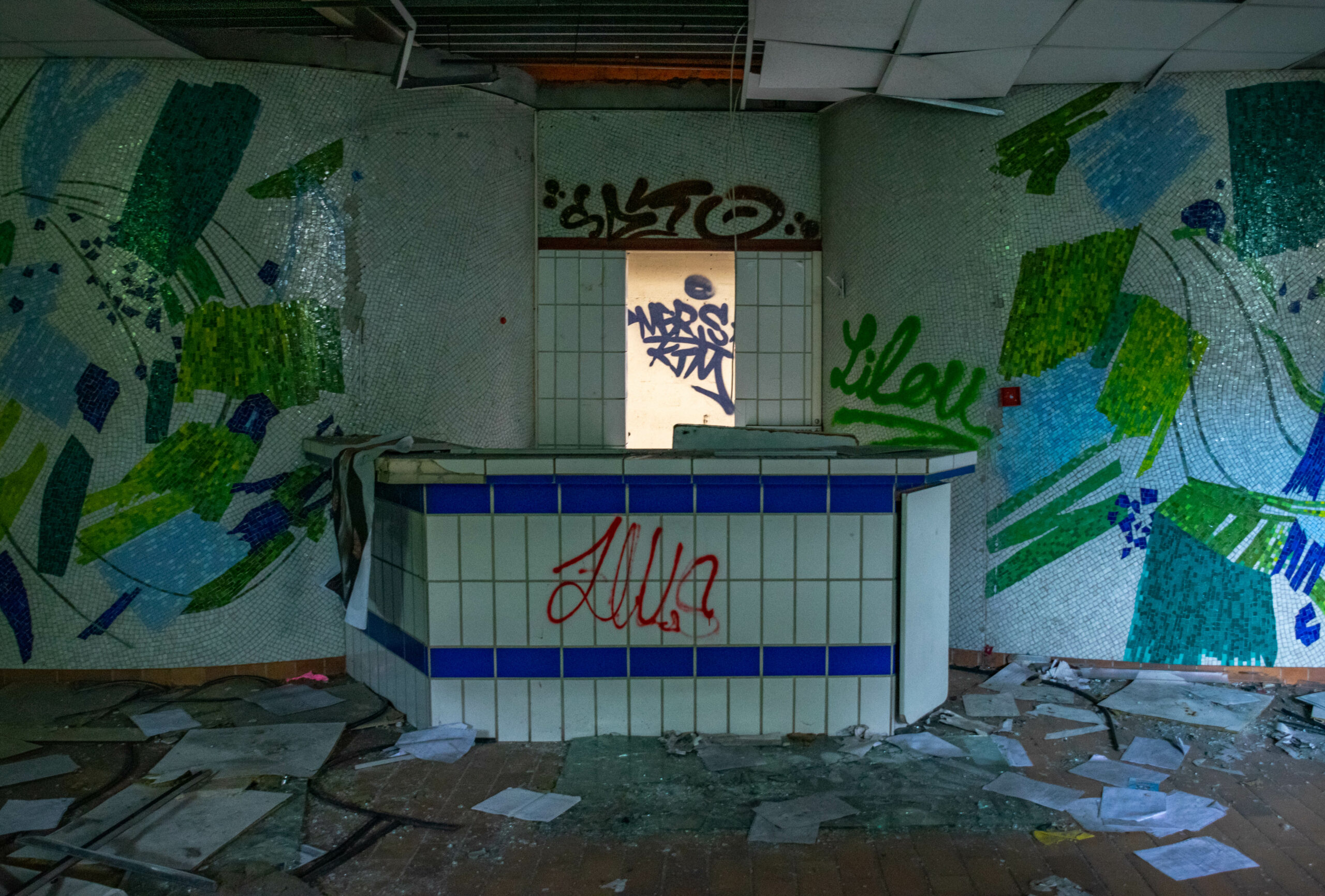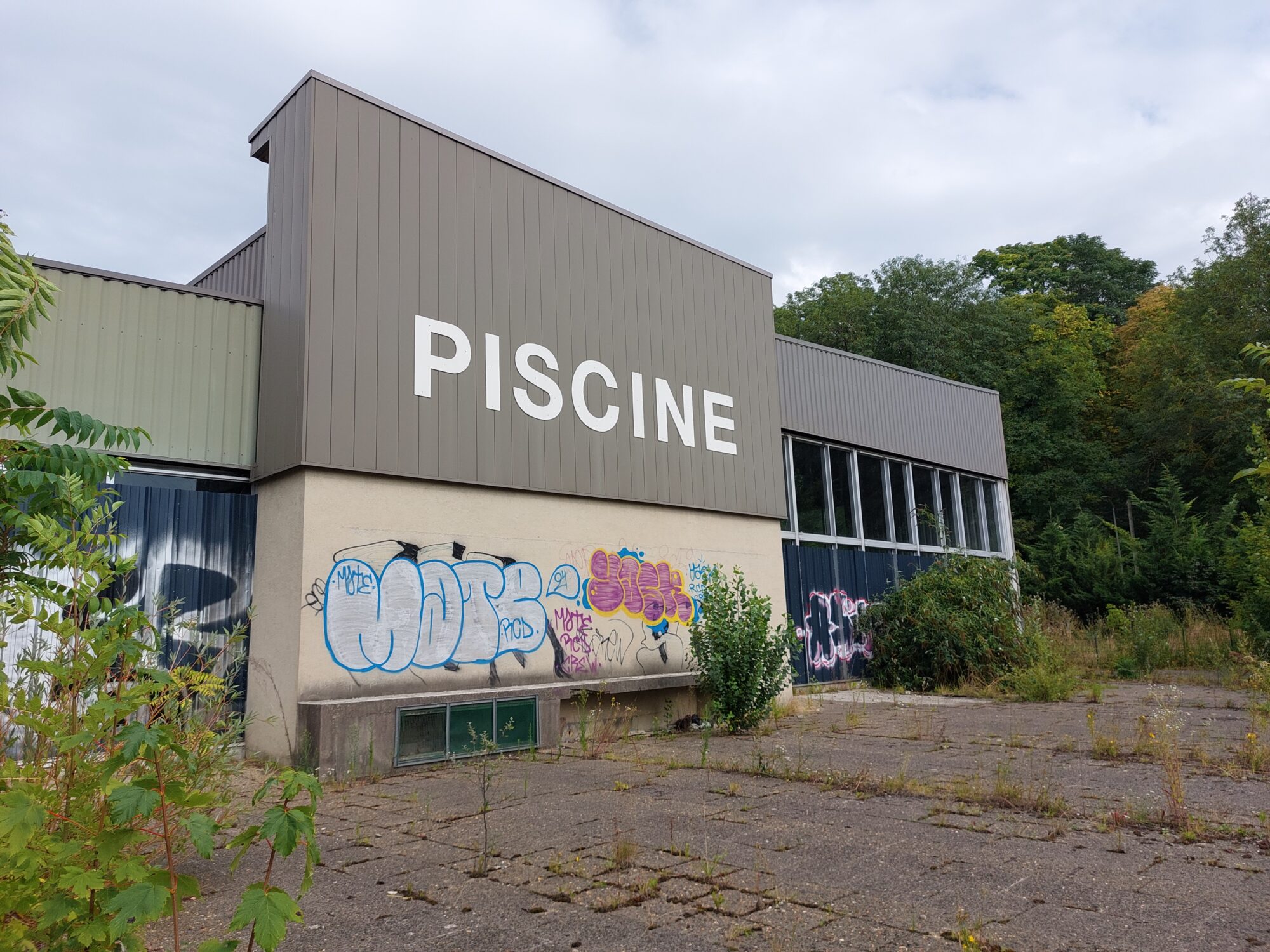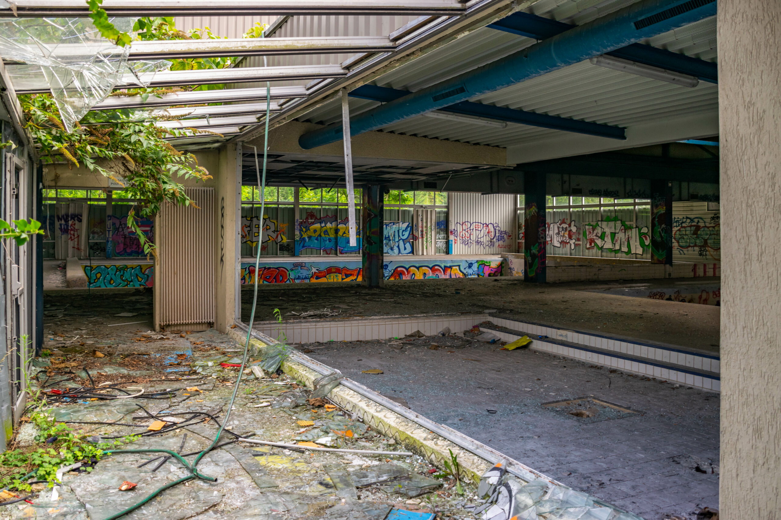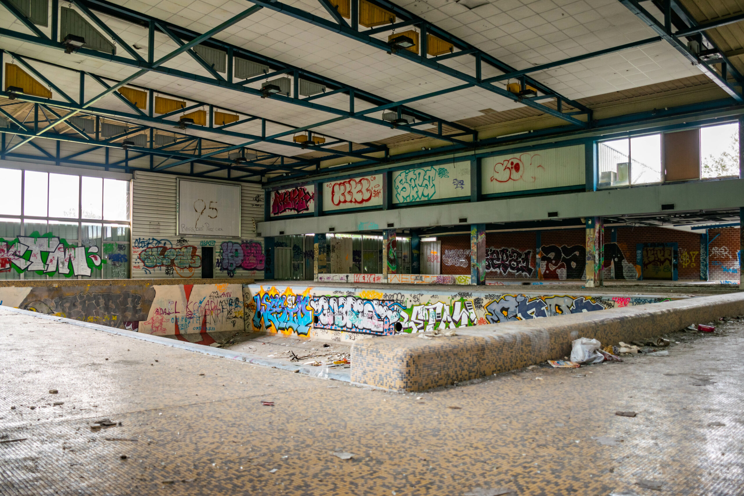 Les lieux, restés ouverts et facilement accessibles, ont malheureusement subi de lourdes dégradations au fil du temps. Le site porte aujourd’hui les stigmates du vandalisme : vitres brisées, cloisons éventrées, cabines et toilettes arrachées, sans oublier les vestiaires complètement saccagés. Les murs, recouverts de tags et de graffitis, témoignent du passage incessant de curieux, de squatteurs et de graffeurs, transformant peu à peu la piscine en un décor urbain chaotique, bien éloigné de sa fonction première.