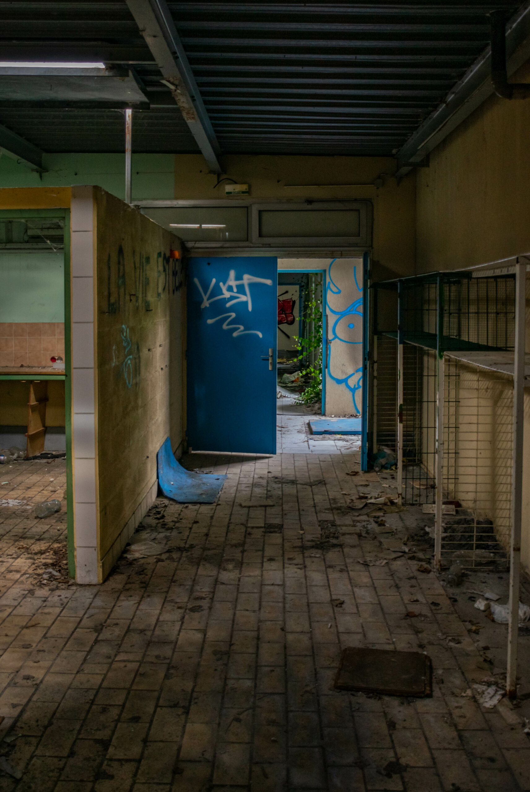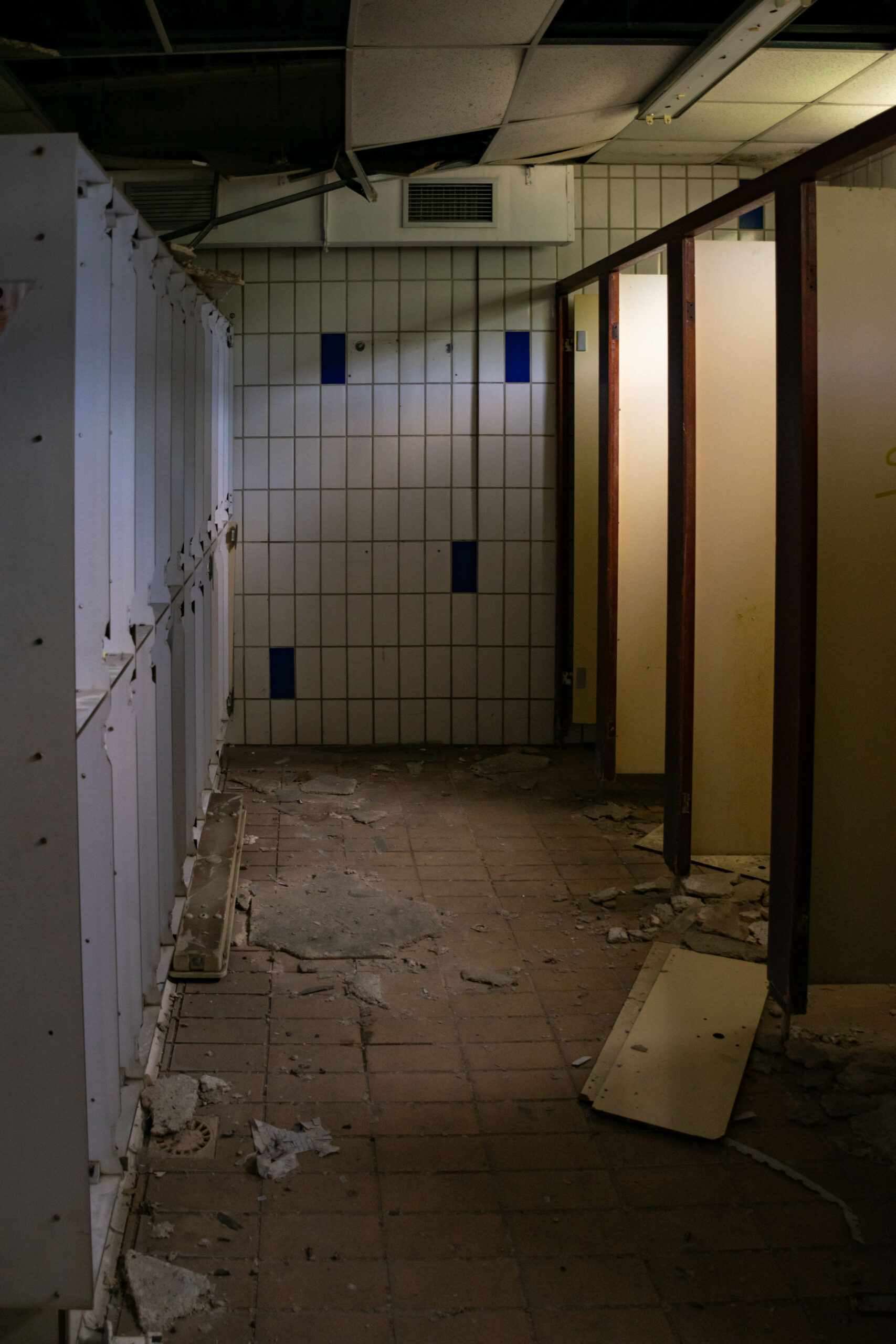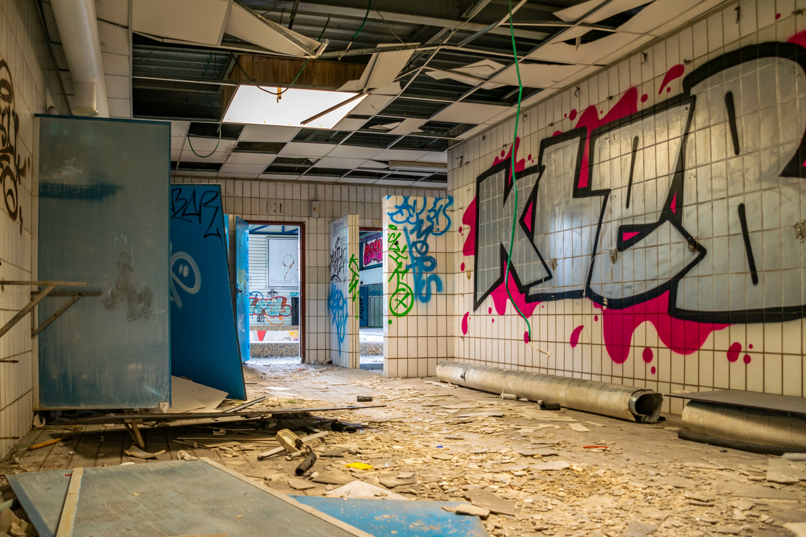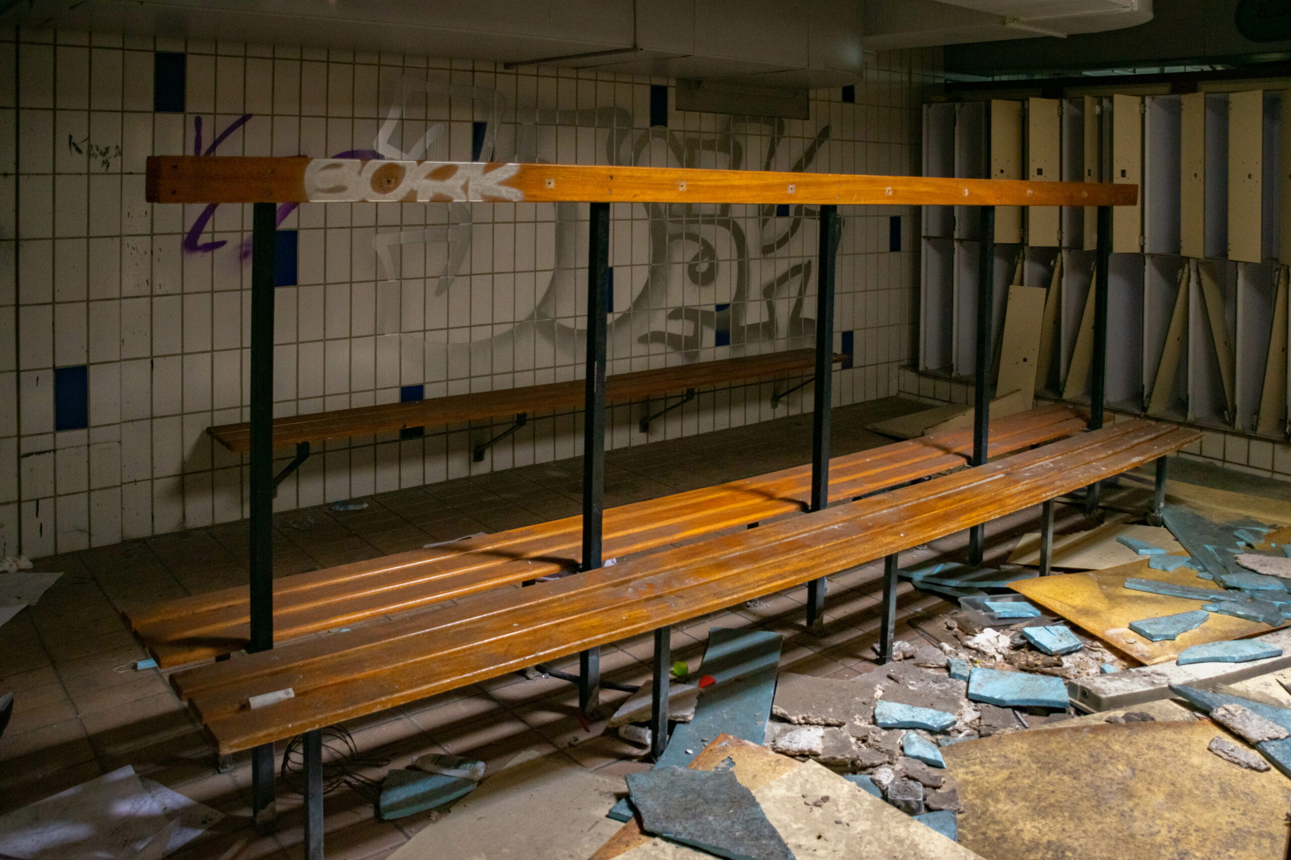 Les lieux, restés ouverts et facilement accessibles, ont malheureusement subi de lourdes dégradations au fil du temps. Le site porte aujourd’hui les stigmates du vandalisme : vitres brisées, cloisons éventrées, cabines et toilettes arrachées, sans oublier les vestiaires complètement saccagés. Les murs, recouverts de tags et de graffitis, témoignent du passage incessant de curieux, de squatteurs et de graffeurs, transformant peu à peu la piscine en un décor urbain chaotique, bien éloigné de sa fonction première.